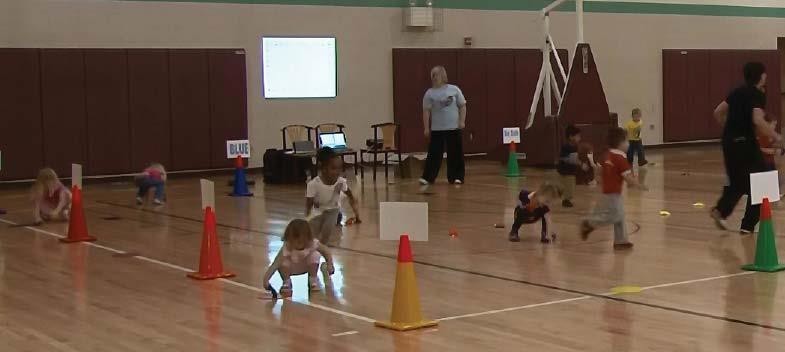 Begin with you (the teacher) leading the children around the room, form boundary to boundary. Travel through all of the space inside the boundaries. Choose as many children as possible in the 10 minutes you warm up traveling. Let the children know; if they didn’t get a turn to be the leader today, they will get to be a leader another time. As you travel around inside the boundaries, continue to review the cones and spots and have the children say names and colors of the equipment.