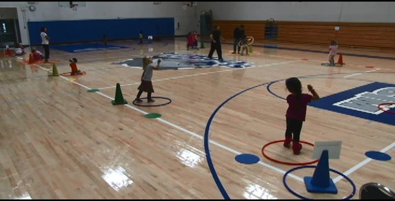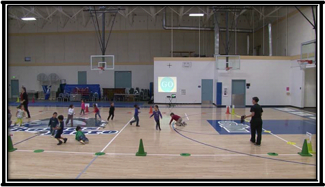 (If Possible, have enough cones around the boundaries so each child can go to a different cone.) “When I say go, find a spot near one of our boundary cones. Once you find a spot near a cone, put your hoop on the ground and stand inside it. “You can ask them to find a cone to be near to that matches the color of their hoop.”